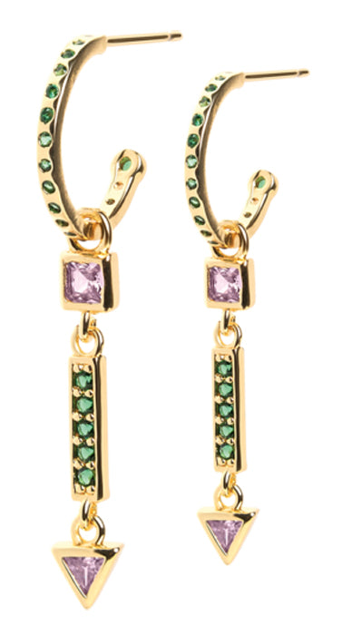 Orecchini pendenti placcati in oro. Con pietre smeraldo e lillà. Realizzati con materiali di alta qualità.