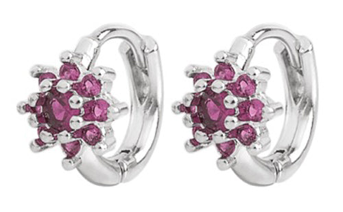 Orecchini in acciaio inossidabile. Le pietre incastonate sul cerchio color argento si dischiudono in un fiore dai petali rosa profondo.